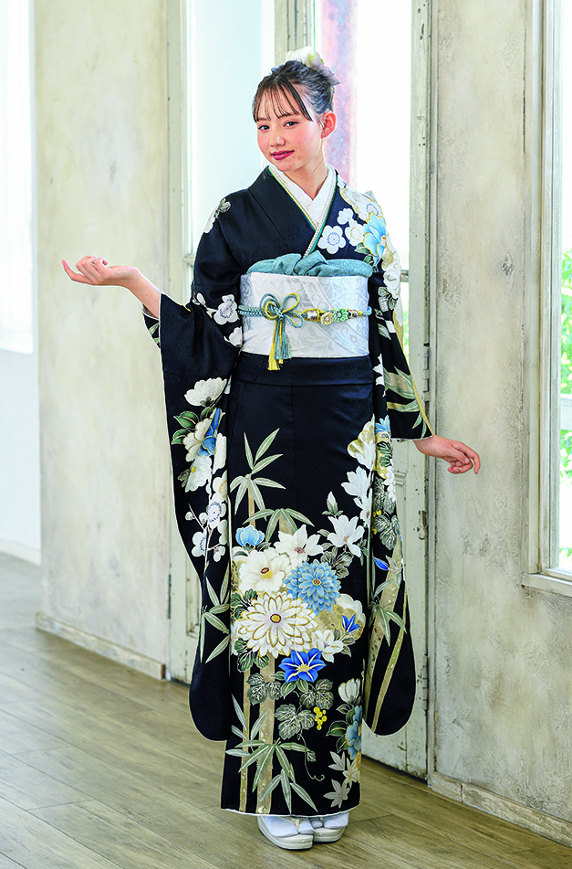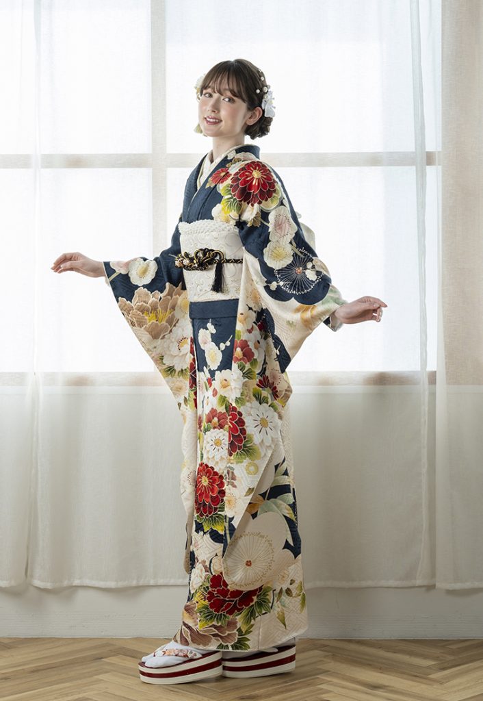深い紺の地色に、藍色の花々スッキリオシャレな ワントーンのお振袖です。本日2月11日に入荷いたしました!!