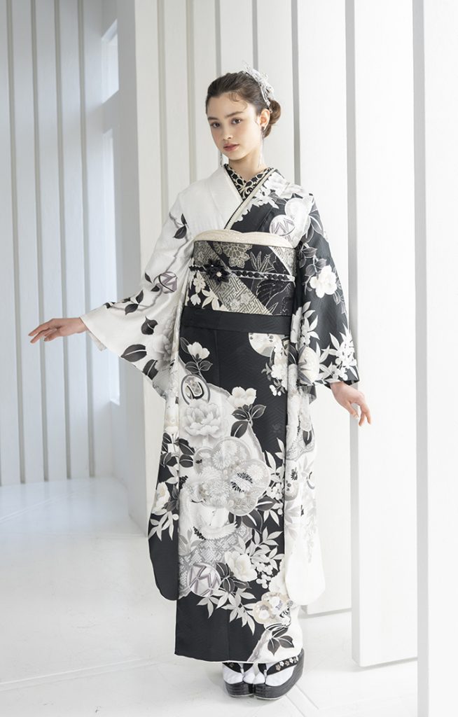 オールモノトーンで目指す、クールな振袖スタイル。 ラインストーンやメタリックを合わせて スタイリッシュさにゴージャスをプラス。 特別な記念日に煌めきを。